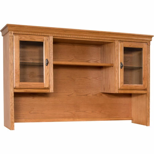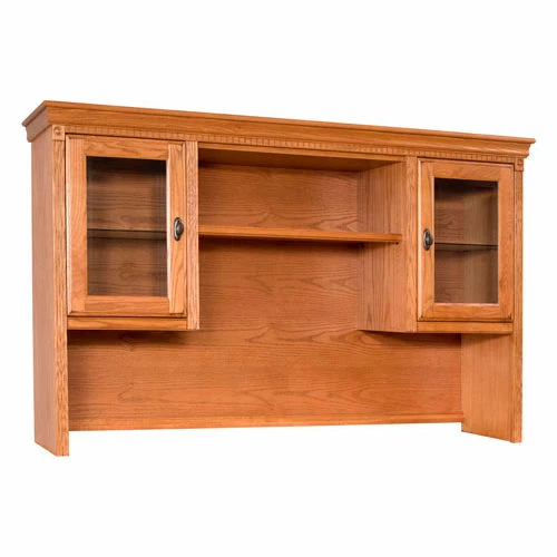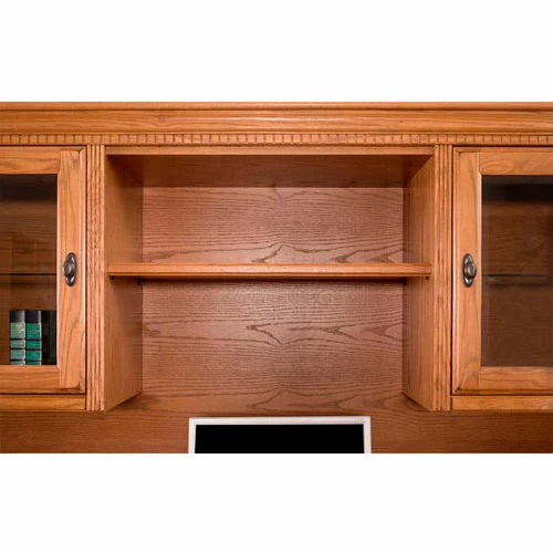 The Huntington Oxford office collection boasts a transitional furniture design built with hardwood solids and veneers. It is available in a traditional oak finish or warm burnish brown finish. The Huntington Oxford collection incorporates a highly detailed finish with hand-applied distressing that includes rasping, wear sanding, dry brushing and pin holes to create texture and depth. This delivers a unique, special worn appearance of fine furniture that has withstood the test of time. The natural grain and beauty of the wood is enhanced by a multi-step, hand rubbed finish. Vertical fluting and dentil molding further add character and aesthetic appeal. The storage hutch includes an adjustable shelf behind each glass door along with a light, and an adjustable center shelf. Ships fully assembled with 5 Year manufacturer warranty.