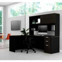 Bestar® L-Desk with Hutch – Deep Gray and Black – Pro-Concept Plus Series