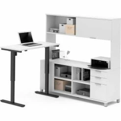 Bestar® L-Desk with Hutch and Electric Height Adjustable Table – White – Pro-Linea Series