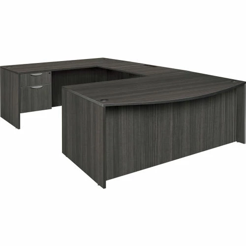 Give your executive office space a grand appearance with a spacious, versatile U-Desk workstation. The U-Shaped desk offers an extra wide work surface with an executive bow front so there is plenty of room to spread out, allowing you to multi-task and efficiently manage large work loads. Strategic grommeting keeps your work area looking clean and desktops cable and clutter free. This 71-inch long Bow Front U-Desk comes with one box-file pedestal with locking drawers and ergonomically designed drawer pulls for convenience and ease in operation. The file drawer accepts both letter and legal filing while the box drawer keeps supplies handy. The interior of the desk is spacious, allowing for plenty of room to move between surfaces. Adjustable glides on the bottom of the bases ensure a level desk top throughout. Finished in an stylish Ash Grey laminate, this U-Desk coordinates with other Legacy furniture which makes customizing easy. The Legacy collection is constructed of a 1-inch thick thermal fused melamine laminate with a 3-millimeter commercial grade matching PVC edge. Laminates are scratch, stain and scald resistant. Legacy casegoods are backed by a 10-year limited manufacturer’s warranty.