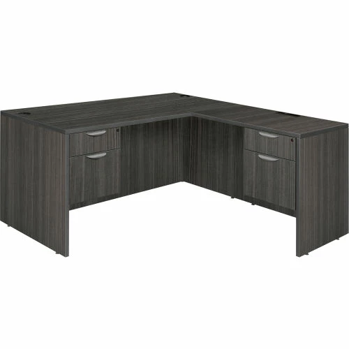 Versatility is just the beginning with so many Legacy desking options. This classic L-shaped corner desk is a great choice for professional and home offices alike. It comes with two box-file pedestals that each have one box drawer and one file drawer that accepts both letter and legal filing. All drawers lock and include ergonomically designed drawer pulls for convenience and ease in operation. Adjustable glides on the bottom of the base keep the desktop level and are easy to adjust. Wire management grommets keep cables clear of work areas. Finished in an stylish Ash Grey laminate, this desk coordinates with other Legacy furniture. The Legacy collection is constructed of a 1-inch thick thermal fused melamine laminate with a 3-millimeter commercial grade matching PVC edge. Laminates are scratch, stain and scald resistant. Legacy casegoods are backed by a 10-year limited manufacturer’s warranty.