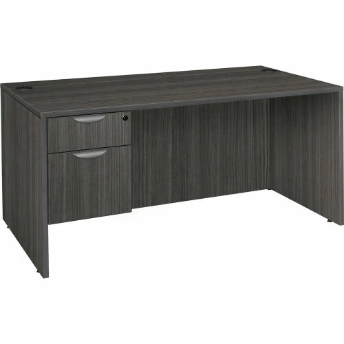 Versatility is just the beginning with so many Legacy desking options. This 71-inch single pedestal desk is a great choice for professional and home offices alike. It comes with a box-file pedestal that has one box drawer and one file drawer that accept both letter and legal filing. The drawer locks and includes ergonomically designed drawer pulls for convenience and ease in operation. Adjustable glides on the bottom of the base keep the desktop level and are easy to adjust. Two wire management grommets keep cables clear of work areas. Finished in an stylish Ash Grey laminate, this desk coordinates with other Legacy furniture. The Legacy collection is constructed of a 1-inch thick thermal fused melamine laminate with a 3-millimeter commercial grade matching PVC edge. Laminates are scratch, stain and scald resistant. Legacy casegoods are backed by a 10-year limited manufacturer’s warranty.