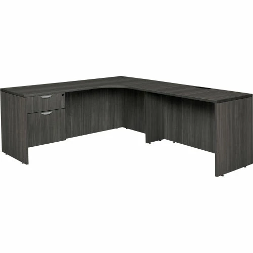 Versatility is just the beginning with so many Legacy desking options. This classic corner workstation has a curved center for a seamless transition between desk and return. On this Right Corner Credenza, the return attaches to the right hand side and it is not reversible. It comes with one box-file pedestal that has one box drawer and one file drawer that accepts both letter and legal filing. Both drawers lock and include ergonomically designed drawer pulls for convenience and ease in operation. Adjustable glides on the bottom of the base keep the desktop level and are easy to adjust. Wire management grommets keep cables clear of work areas. Finished in an stylish Ash Grey laminate, this desk coordinates with other Legacy furniture. The Legacy collection is constructed of a 1-inch thick thermal fused melamine laminate with a 3-millimeter commercial grade matching PVC edge. Laminates are scratch, stain and scald resistant. Legacy casegoods are backed by a 10-year limited manufacturer’s warranty.