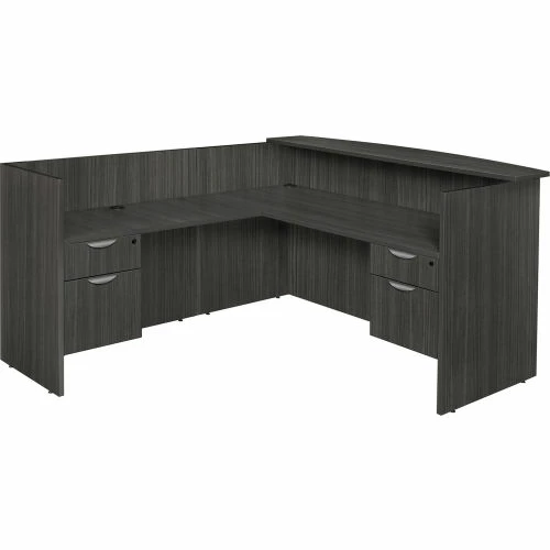 Greet visitors properly with the Legacy Reception Collection! This 71-inch long Reception desk comes with two box-file pedestals with locking drawers and ergonomically designed drawer pulls for convenience and ease in operation. Both file drawers accept both letter and legal filing while box drawers keep supplies handy. A transaction top stands at 42-inches high for guests’ convenience and the wrap-around sides make for a more private work area. Wire management grommets keep cables clear of desktops. Adjustable glides on the bottom of the base keep the desktop level and are easy to adjust. Finished in an stylish Ash Grey laminate, the Reception Desk coordinates with other Legacy furniture which makes customizing easy. The Legacy collection is constructed of a 1-inch thick thermal fused melamine laminate with a 3-millimeter commercial grade matching PVC edge. Laminates are scratch, stain and scald resistant. Legacy casegoods are backed by a 10-year limited manufacturer’s warranty.