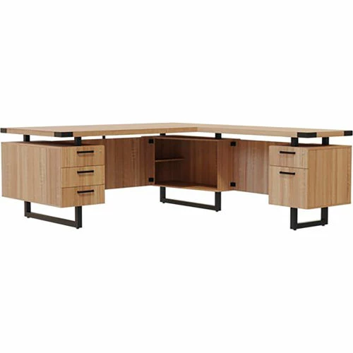 - Complete with double pedestals featuring one with three storage-sized drawers and one with a storage drawer and a file drawer accentuated with discrete brackets giving the appearance of a floating workstation