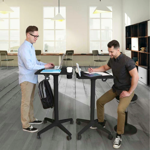 Engage your classroom in active learning with Seville Classics Airlift® XL Sit-Stand Adjustable Mobile Student Classroom Desk. Improve your classroom environment by reducing backpack clutter and the chance of spills with this thoughtful design. Work in comfort with the built-in cup holder and organizer tray with tablet stand. The extra-large (25.6″ x 21.6″) MDF table top finished in a smooth PVC laminate provides a spill-proof and durable work surface. Simply squeeze the Airlift® lever to rise from 30.5″ to 45.6″ high quickly and quietly on the pneumatic cylinder. Desk can lift up to 33 lbs. evenly distributed across the unit. A heavy-duty steel base with large 3″ rubber casters (2 locking) provide smooth-gliding mobility over carpet and wood floors. It’s perfect for educators looking to improve activity in the classroom. Assembly is easy with all required tools included with detailed instructions.