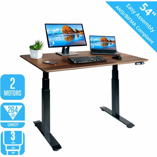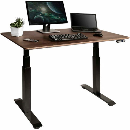 Save up to four memory settings and adjust to the perfect height throughout the day with the digital height controller. An LED display lets you know how high the desk is as it rises and descends. The top (54″ x 28″) features rounded corners. On the bottom, the edges of the table slope inward. Desk base is finished in black, with the top finished in walnut 3D laminate. Assembly is easy and can be done in minutes with the included tools. Use it as a home desk replacement, or as an instant upgrade to office spaces for large and small businesses.