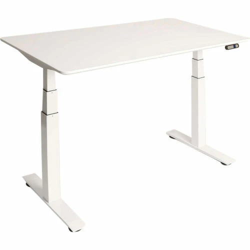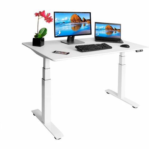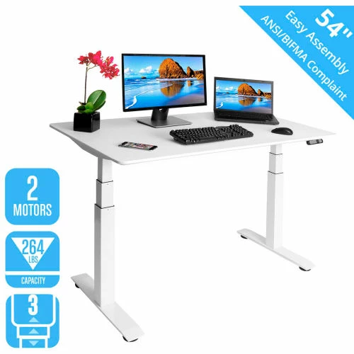 Save up to four memory settings and adjust to the perfect height throughout the day with the digital height controller. An LED display lets you know how high the desk is as it rises and descends. The top (54″ x 28″) features rounded corners. On the bottom, the edges of the table slope inward. Desk base is finished in white, with the top finished in black 3D laminate. Assembly is easy and can be done in minutes with the included tools. Use it as a home desk replacement, or as an instant upgrade to office spaces for large and small businesses.