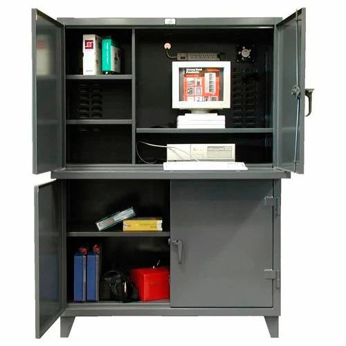 This 12 gauge all welded computer cabinet features an upper compartment that has 3 adjustable shelves. The 2 on the left side are 18 inches wide and the 1 on the right side is 35 inches wide. A 7 outlet, 15 amp, 100 volt power strip and a fan for filtration come installed.