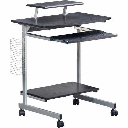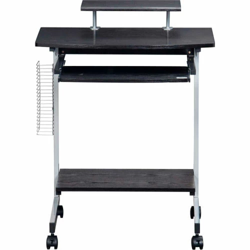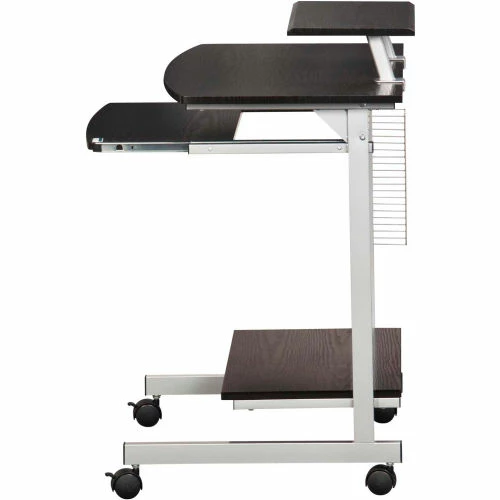 This Techni Mobili Compact Computer Desk is made with heavy-duty engineered wood panels with a moisture resistant PVC laminate veneer and a scratch-resistant powder-coated steel frame. The adjustable shelf can be mounted center, right or left of desktop. It also features a slide-out keyboard shelf equipped with a safety stop, side media rack for CDs or DVDs, bottom accessory shelf, large bottom shelf to accommodate a CPU and accessories, and large double-wheel non-marking locking casters. The desktop has a 100 lb weight capacity, the shelves each have a 30 lb weight capacity, and the keyboard shelf can hold up to 20 lbs. COLOR: Espresso.