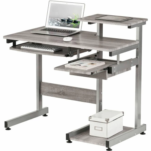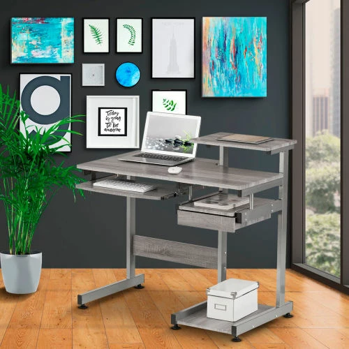 This Techni Mobili Complete, Space Saving Computer Workstation its lends an air of traditional workmanship to it’s versatile contemporary design. It has a simple yet sturdy design made of heavy-duty engineered wood panels with a moisture resistant PVC laminate veneer and a scratch-resistant powder-coated steel frame. The keyboard shelf, adjacent shelf and utility drawer are all mounted on slide out tracks featuring safety stops and have a 30 lb. weight capacity. The spacious desktop can hold up to 80 lbs. Color: Gray.
