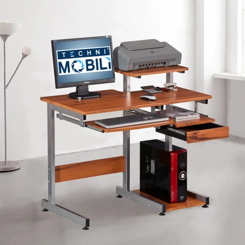 This Techni Mobili Complete, Space Saving Computer Workstation its lends an air of traditional workmanship to it’s versatile contemporary design. It has a simple yet sturdy design made of heavy-duty engineered wood panels with a moisture resistant PVC laminate veneer and a scratch-resistant powder-coated steel frame. The keyboard shelf, adjacent shelf and utility drawer are all mounted on slide out tracks featuring safety stops and have a 30 lb. weight capacity. The spacious desktop can hold up to 80 lbs. Color: Wood Grain.