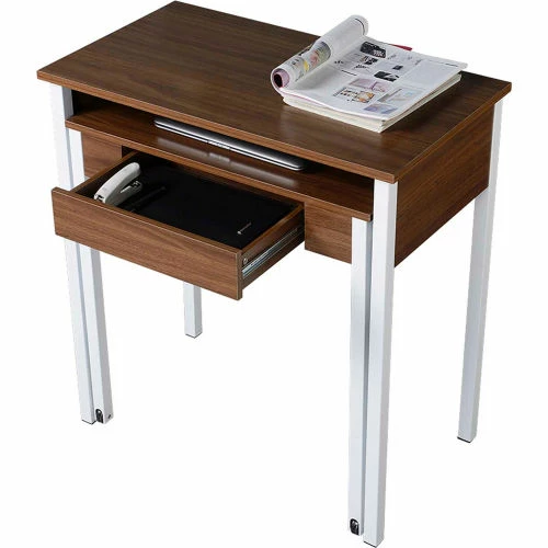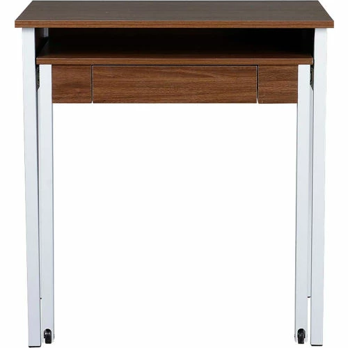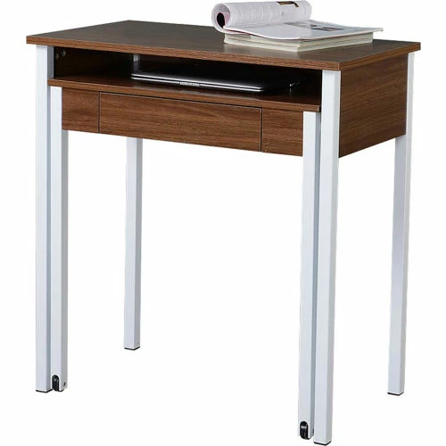 This Techni Mobili Compact Retractable Desk with Storage is constructed out of particle board with a laminate surface and supported by white powder coated steel legs. Its Versatile space saving design extends and retracts. The under table desk area includes a drawer which packs ample storage while at the same time offers an additional desktop space into this compact modern desk. Easy and ready to assemble. Desktop has a 70-lb. Weight Capacity. Color: Walnut.