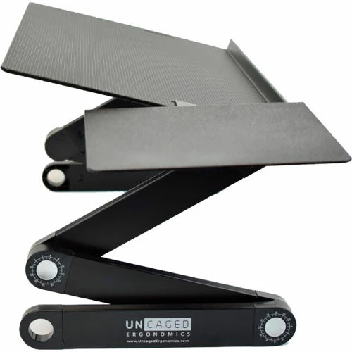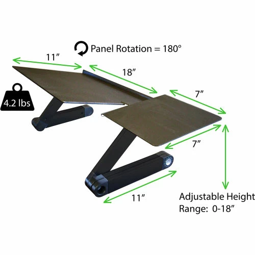 - Keyboard Tray: 18″ wide Aluminum panel which comfortably holds most keyboards. Orients keyboards at a flat, or downward-angle for optimal typing health and adjusts up to 18″ high for standing.